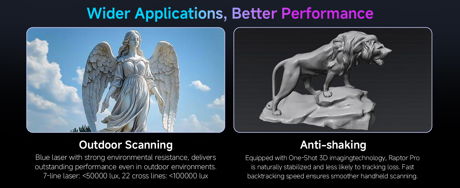 【Fast Frame Rates for Smooth Scanning】Achieve real-time scanning at up to 60fps in laser mode and 30fps in infrared mode. Paired with anti-shake stabilization, Raptor Pro offers fluid, interruption-free handheld scanning.