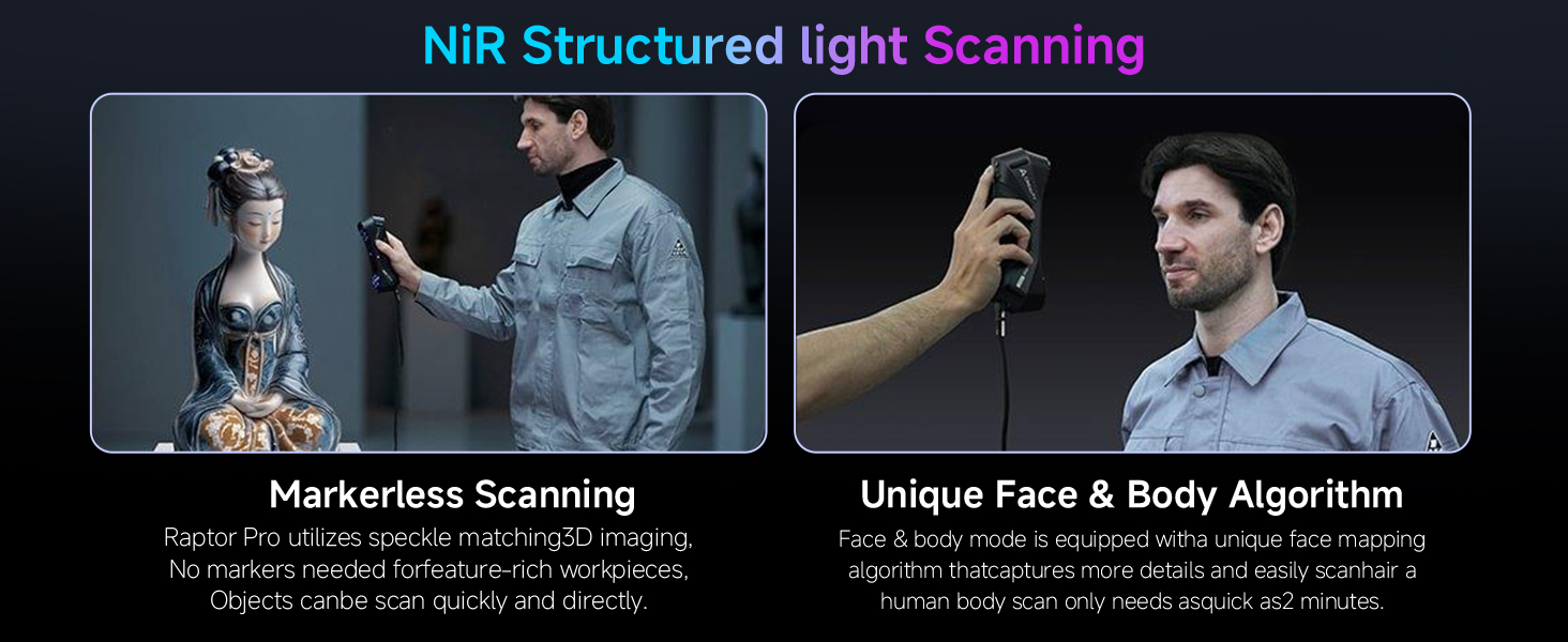 【Human Body & Face Scanning in 2 Minutes】Designed with advanced facial mapping algorithms and dedicated body scan mode, the Raptor Pro captures fine human features including hair, skin texture, and clothing folds in record time.