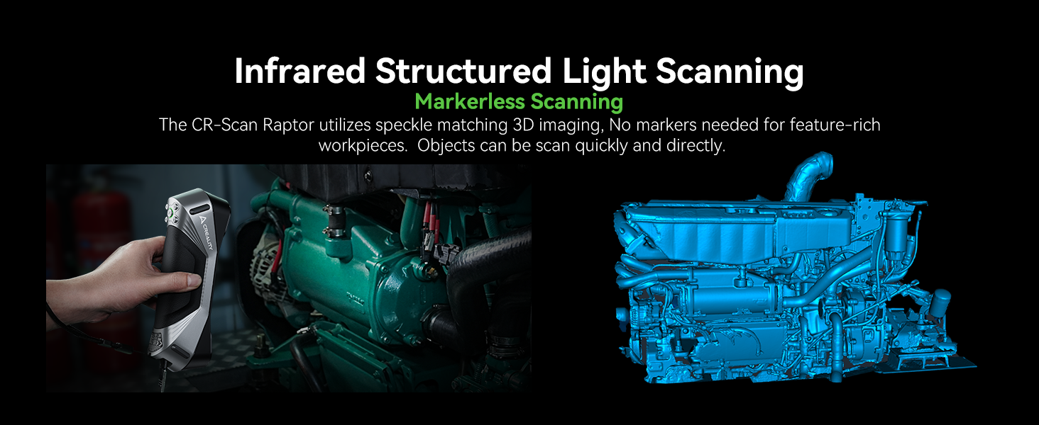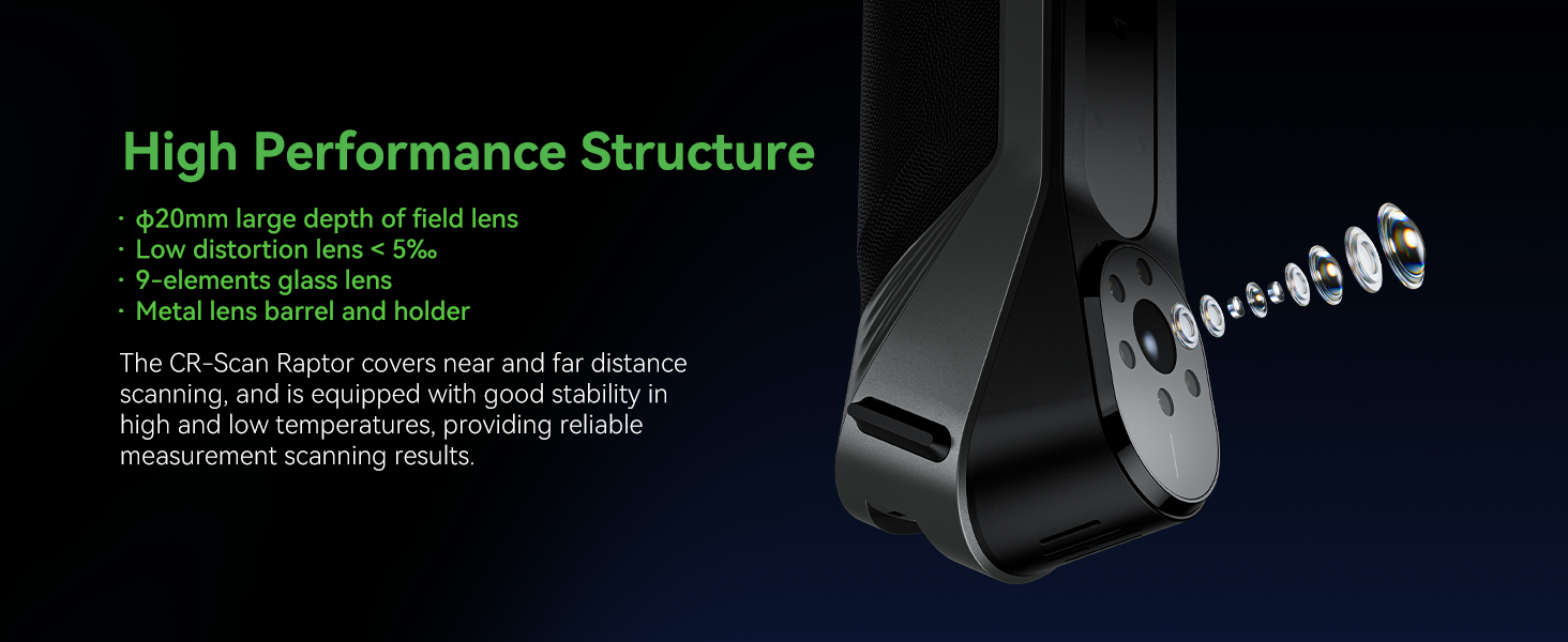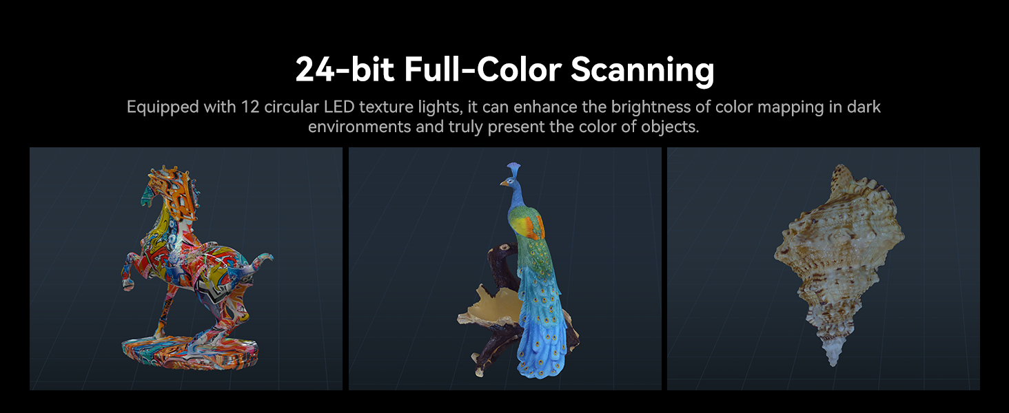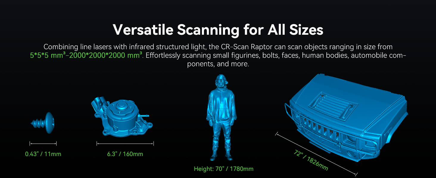 【High-Speed Scanning】Blue light mode scans up to 60fps, infrared mode up to 20fps. Handles objects from 5×5×5 mm to 2000×2000×2000 mm, delivering fast and accurate scans for diverse applications.