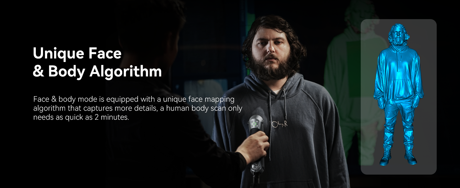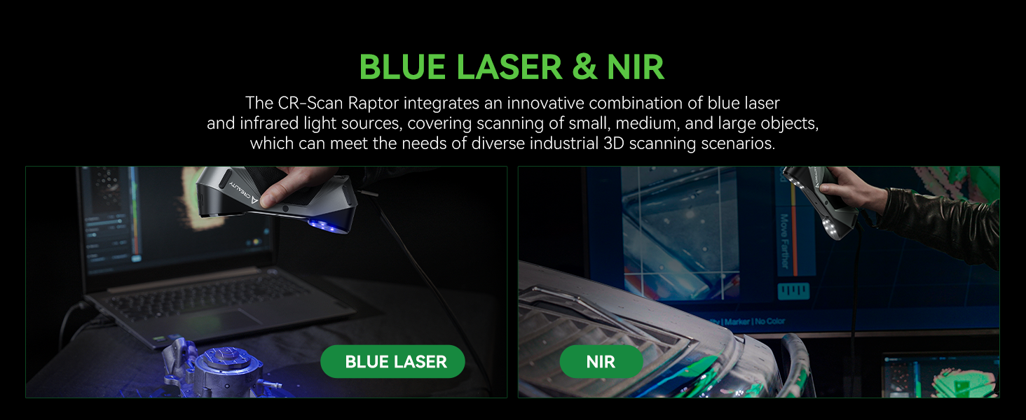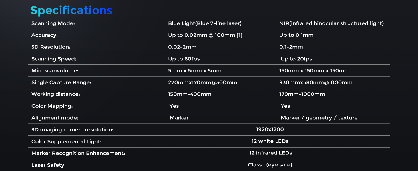 【2-in-1 Blue Light & NIR】Combines blue laser for high-precision scanning with optional markers and infrared mode for marker-free scans of faces, bodies, and artifacts, adapting to various scanning scenarios seamlessly.