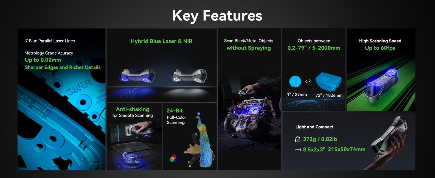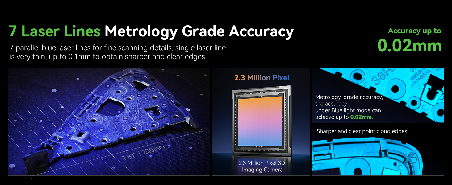 【Ultra-Precision Blue Light Scanning】Features 7 parallel blue laser lines, with each line as thin as 0.1mm for sharper and clearer edges. Scanning accuracy reaches up to 0.02mm, capturing every detail with precision.