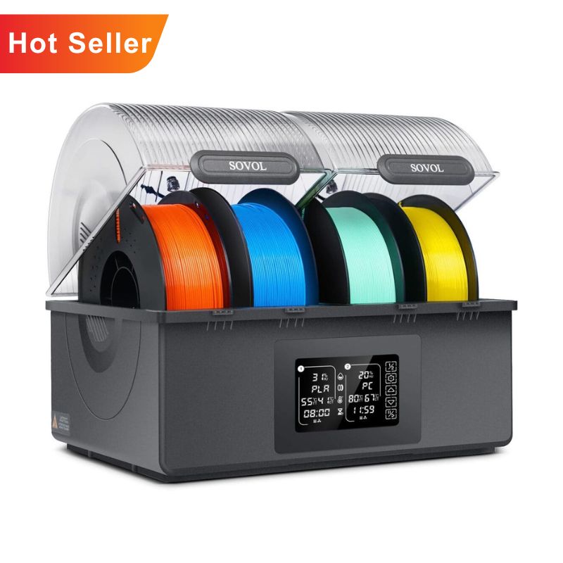 Dual Independent Heating Chambers: Sovol SH03 dry box comes with 2 chambers controlled independently. You can only use one of them or make both 2 chambers working at the same time to heat up to different temperature for different type of filaments. Since SH03 can be sealed to store dried filaments without power, you can also make one chamber drying while another one for storage without power