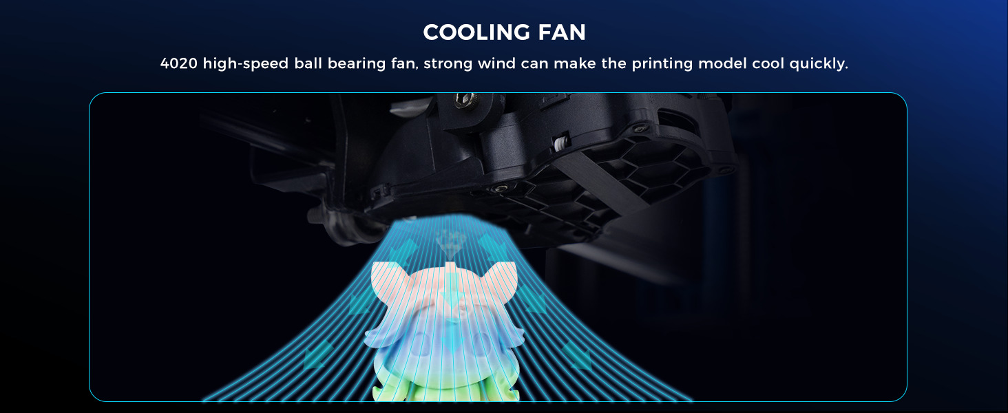 Robust 4020 high-speed ball bearing fan that generates strong airflow for rapid cooling of printing materials. This effective cooling solution minimizes warping and enhances layer adhesion, ensuring high-quality prints with precision and consistency.