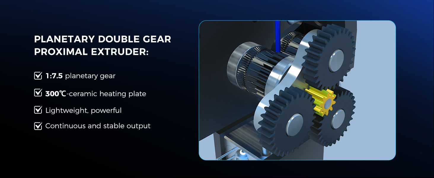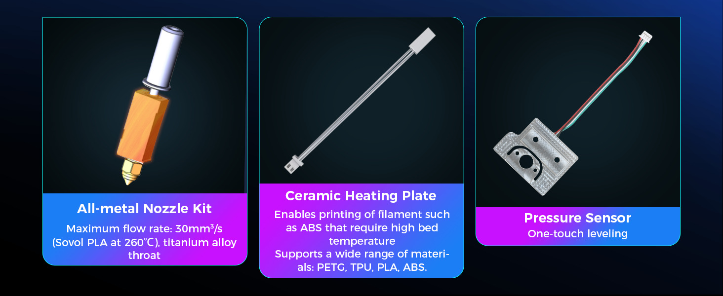 Sovol SV06 ACE is equipped with a planetary dual gear extruder featuring a 1:7.5 gear ratio, ensuring lightweight construction and powerful, consistent output. With a 300℃ high-temperature nozzle, the SV06 ACE supports a wide range of materials: PETG, TPU, PLA, ABS