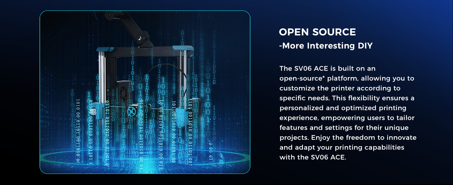 SV06 ACE is built on an open-source platform, allowing you to customize the printer according to specific needs. This flexibility ensures a personalized and optimized printing experience, empowering users to tailor features and settings for their unique projects. Enjoy the freedom to innovate and adapt your printing capabilities with the SV06 ACE