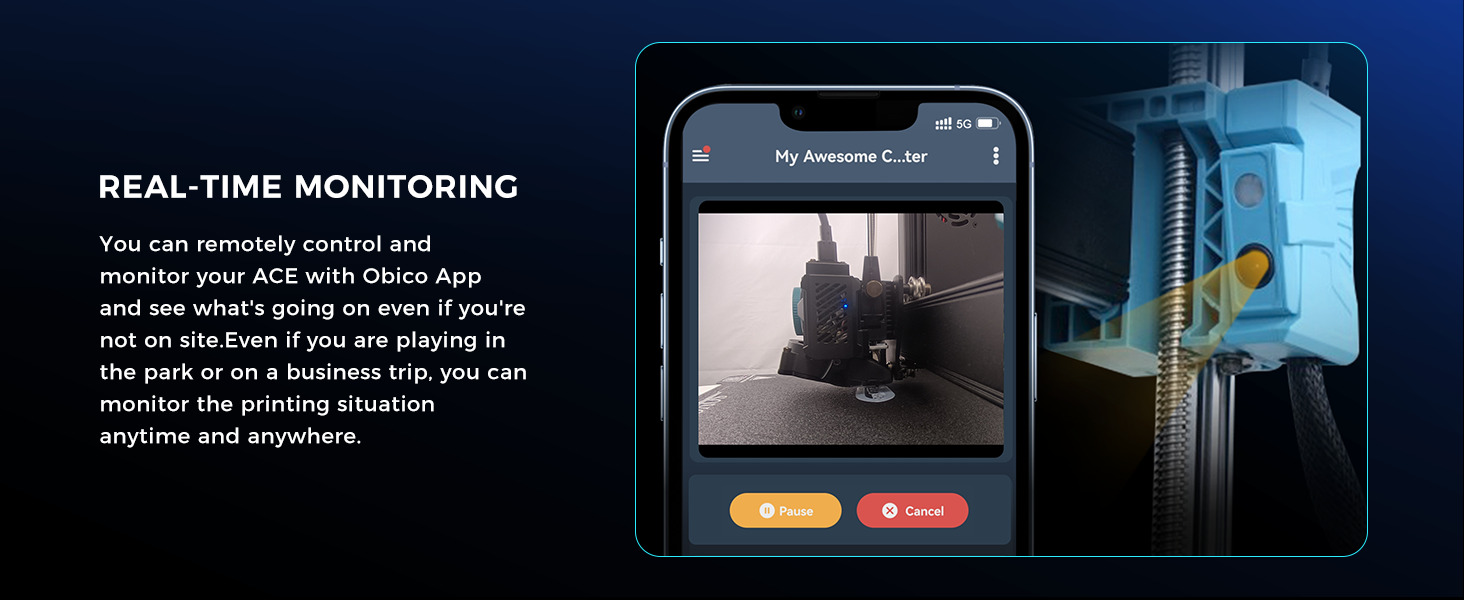 You can remotely control and monitor your ACE with Obico App and see what's going on even if you're not on site.Even if you are playing in the park or on a business trip, you can monitor the printing situation anytime and anywhere.