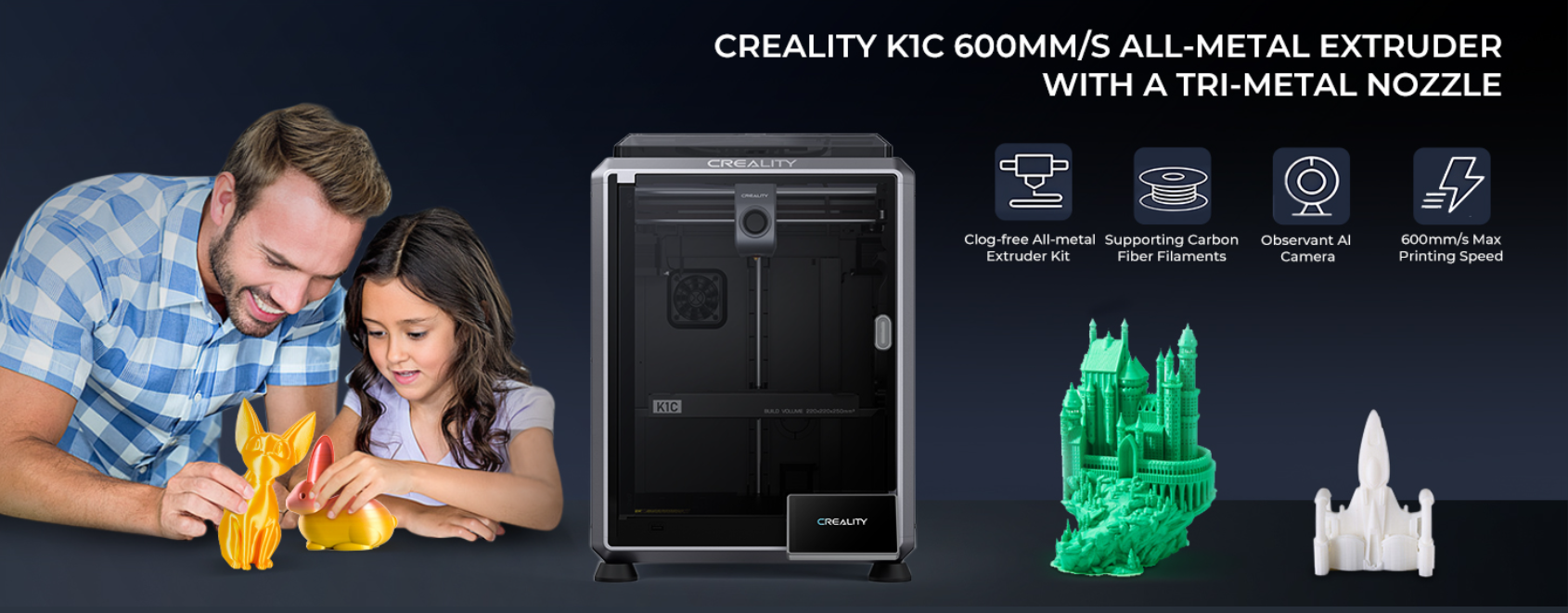 Equipped with a clog-free direct extruder and a tri-metal Unicorn nozzle, the K1C handles high-temperature materials like carbon fiber filaments effortlessly, ensuring consistent extrusion and reliable operation with easy nozzle swaps.