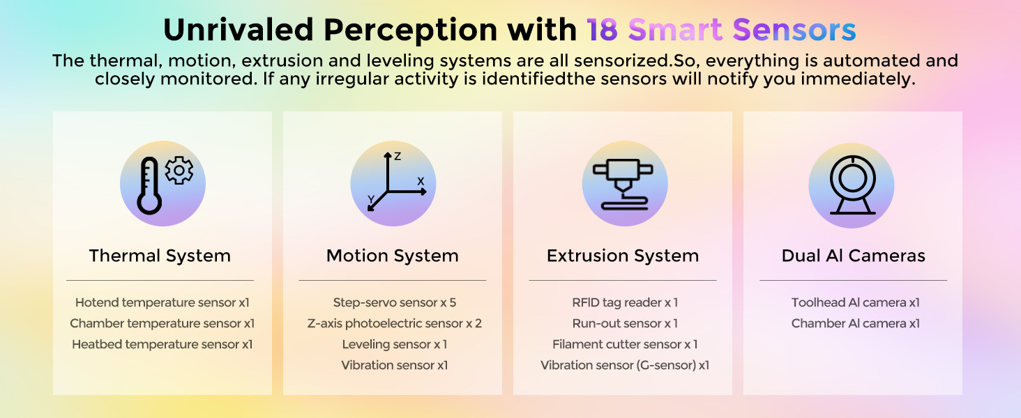 Next-Gen AI Automation & Monitoring: Equipped with dual AI cameras and 18 sensors, the system actively monitors the nozzle and print chamber, detecting spaghetti faults, flow inconsistencies, and errors. This intelligent automation reduces print failures and ensures a hassle-free experience.