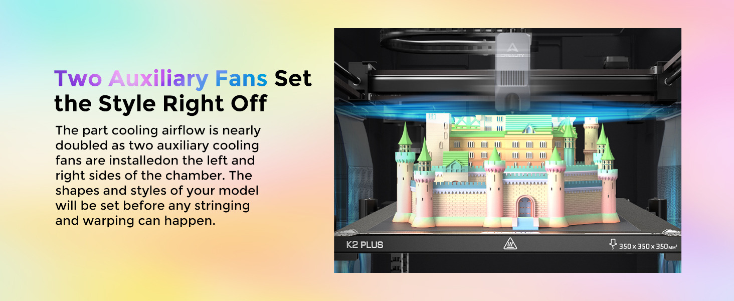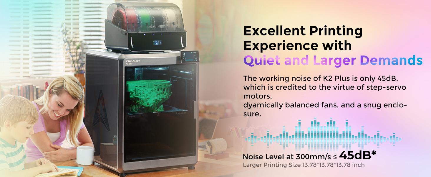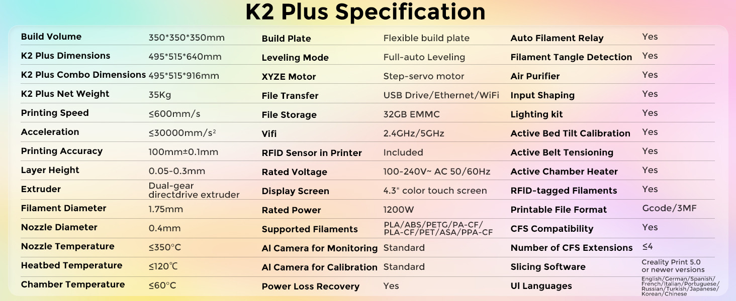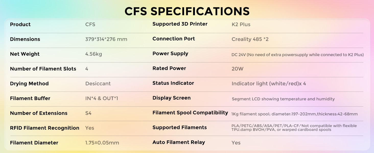 Multicolor Printing with CFS: The K2 Plus Combo includes the K2 Plus 3D printer and one CFS (Color Filament System) unit. The CFS has four slots to hold different filament colors simultaneously. With dynamic mixing, the system enables up to 16-color blending in a single print. Filaments are not included in this combo.