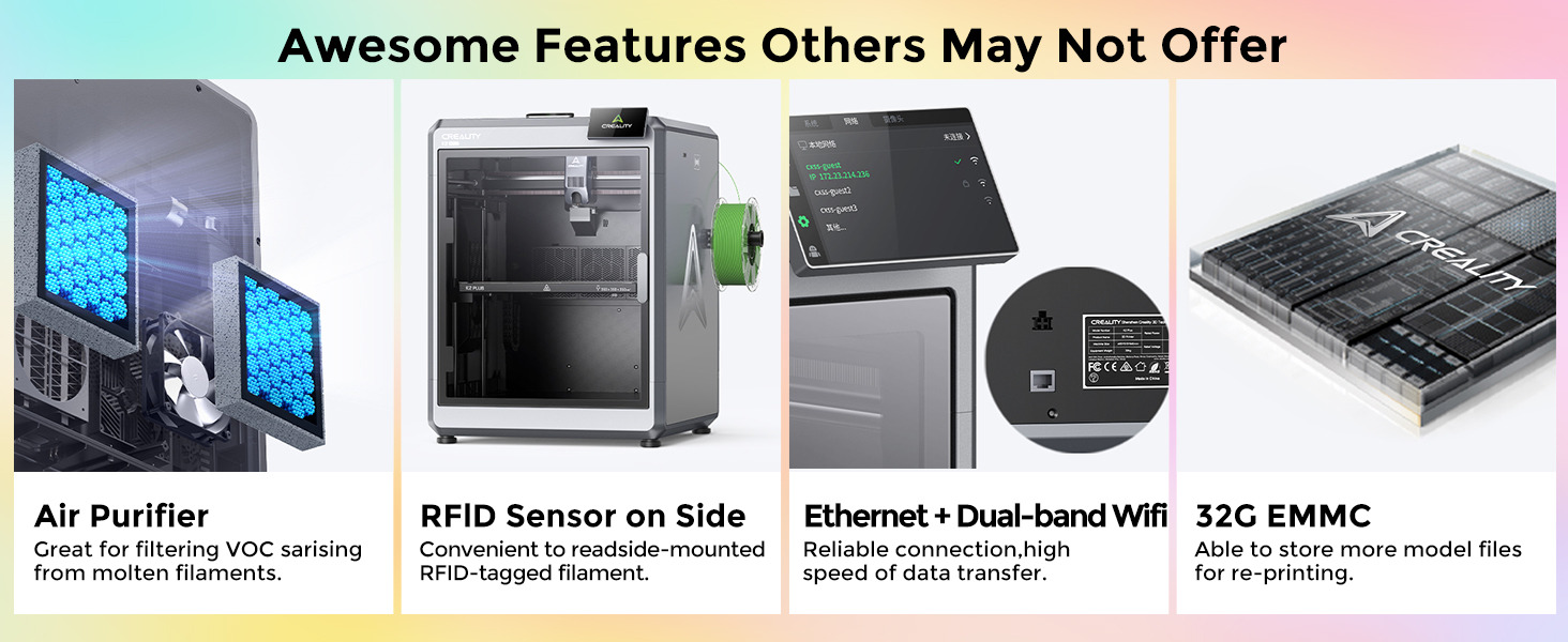 Smart Filament Management: The included CFS unit allows for automatic filament switching between four different colors. It also provides sealed storage and drying, keeping filaments in optimal condition for smooth and reliable printing.